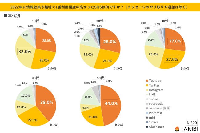 キャンプやグランピングを中心としたアウトドア総合情報サイト「TAKIBI」の運営をおこなう株式会社フォーイットは、全国の10代〜50代までの男女500人を対象に情報収集で利用頻度の高かったSNSに関するアンケートを実施し、男女別・年代別等の特徴についてまとめました。