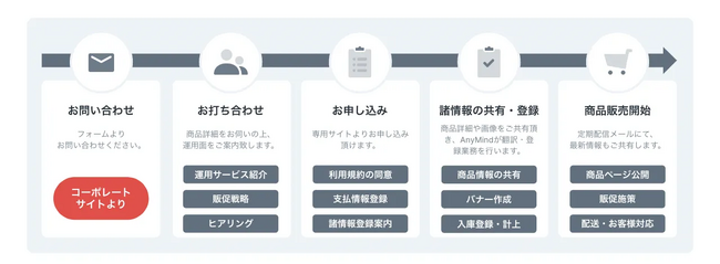 海外現地で事業を開始するにあたってはビジネスライセンスや法人設立など、然るべきプロセスを踏む必要がありますが、本サービスでは当社が保有する店舗を利用するため、簡単なステップのみですぐに商品を販売することができます。