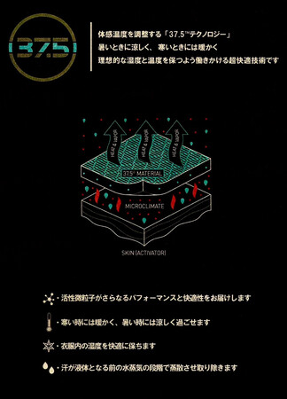 「37.5Rtechnology」は火山砂から作られた、天然由来の「37.5R活性微粒子」を使用した技術。37(サウナ)Tシャツには、「37.5R活性微粒子」加工された糸が使われています。