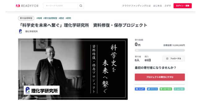 また、本日14時に、第1号案件として「科学史を未来へ繋ぐ〜理化学研究所 資料修復・保存プロジェクト〜」を公開、寄付募集を開始いたしました。