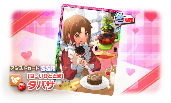 →冬限定で登場のアシストカード。タバサの「オーラチョコを添えて」は赤オーラ限定の新効果で育成中にアイテムを使うと、追加効果で体力回復&忠誠度アップが必ず発生します。
