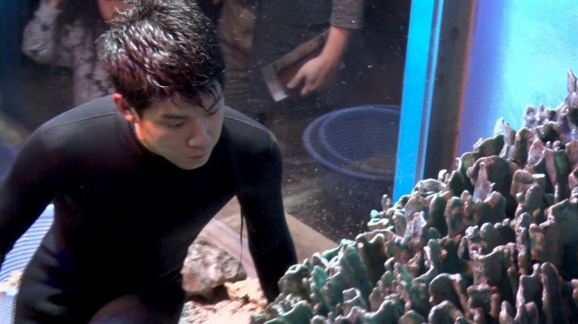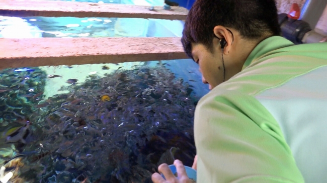 掃除をするのは沖縄の海をテーマにした水槽。