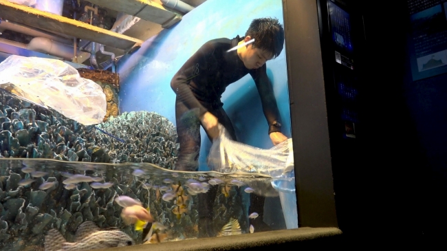 デバスズメダイやオジサンをはじめ、小さな熱帯魚が約1000匹生息する水槽の水を抜くレバーを倒すと、ダイバースーツに着替えた飼育員が中に入り、袋を使って魚を捕まえます。水が減ると魚の密度が高くなり、酸素濃度が低くなってしまうので急いで捕まえなければなりません。