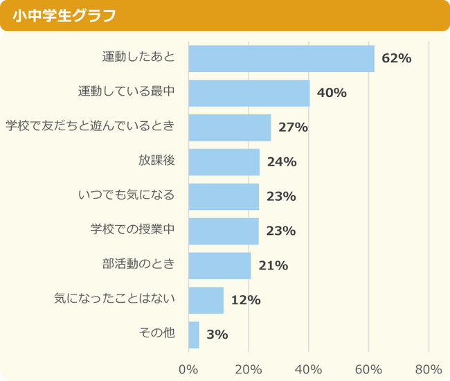 「運動したあと」と答えた小中学生が一番多く、2位は「運動している最中」、3位は「学校で友だちと遊んでいるとき」でした。