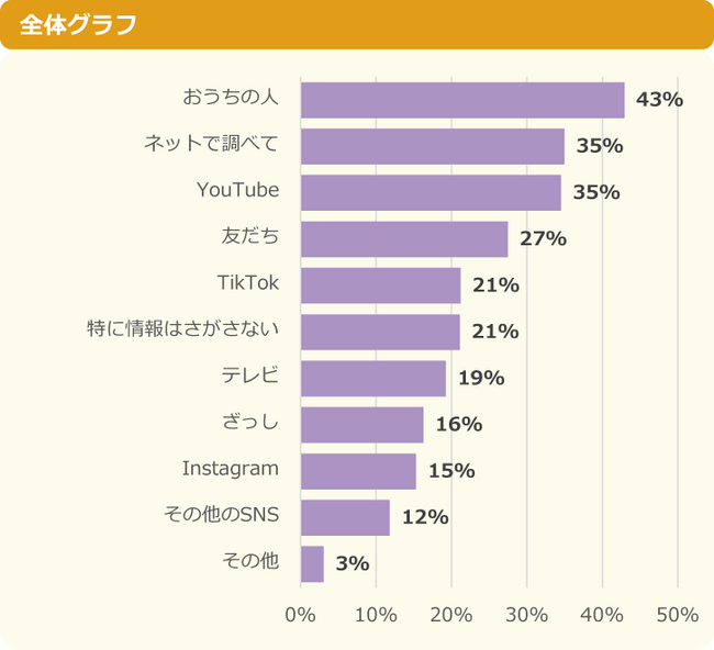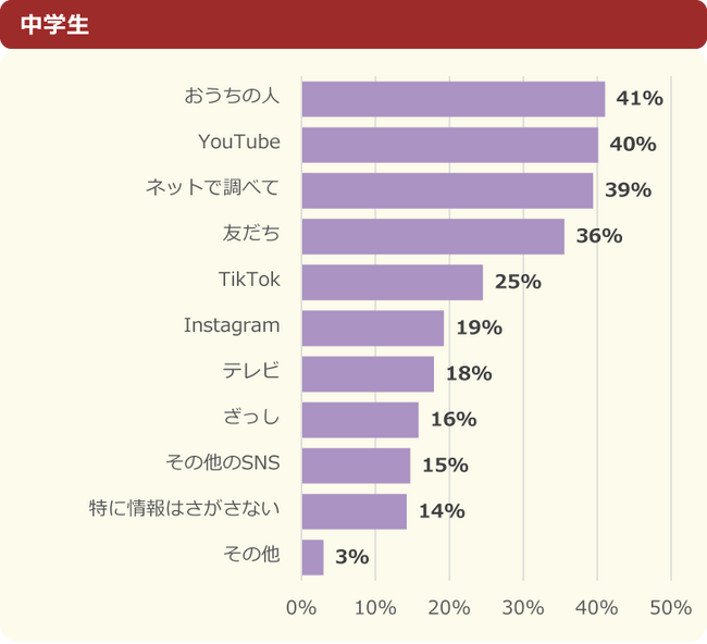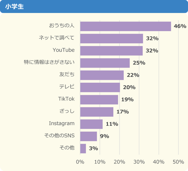 小学生では1位が「おうちの人」で46%と半数に近い回答でしたが、中学生では「おうちの人」以外からも情報を得ている人が多いようです。中学生の4位以下は、「友だち」「TikTok」「Instagram」が小学生より増えていて、おうちの人に聞くだけでなく自分で調べて情報を探す人が多くなっていることがわかりました。