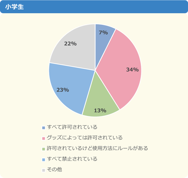 「すべて禁止されている」人は小学生が23%で、中学生の12%に比べて多い割合になっています。中学生では「すべて許可されている」や「許可されているけど使用方法にルールがある」と答えた人が増えていて、小学生よりもルールが緩和されていることがわかりました。