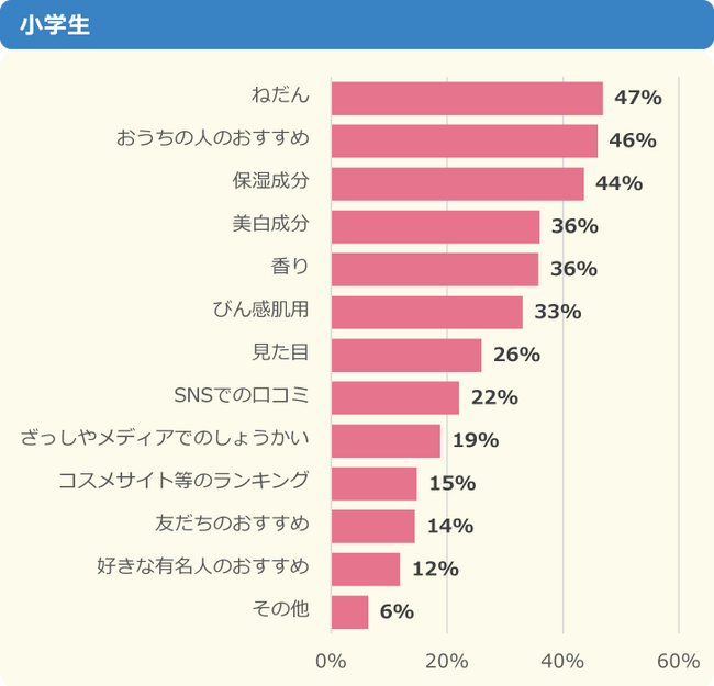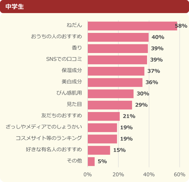 中学生では「値段」を重視している人が58%と半数以上を占めて1位でした。小学生のうちはおうちの人が選んで買っていても、中学生になると自分のおこづかいで買う人が増えるのかもしれません。