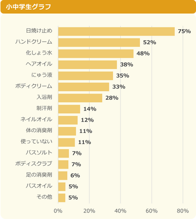 「日焼け止め」を使っている小中学生は75%でした。「ハンドクリーム」は52%、「化粧水」は48%と、約半数の人が使っていることがわかりました。
