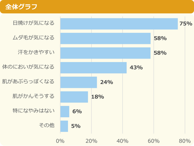 その他の回答には「日焼けする所すべて」「ムダ毛がある腕や足」と答えた人が目立つ中、「胸」を気にしている人もいることがわかりました。