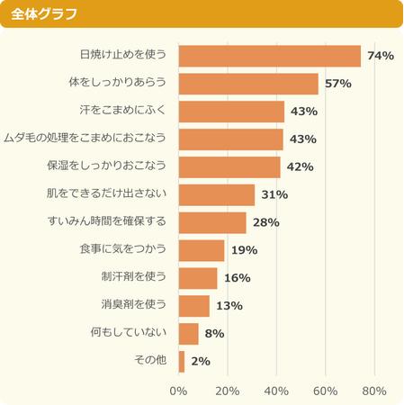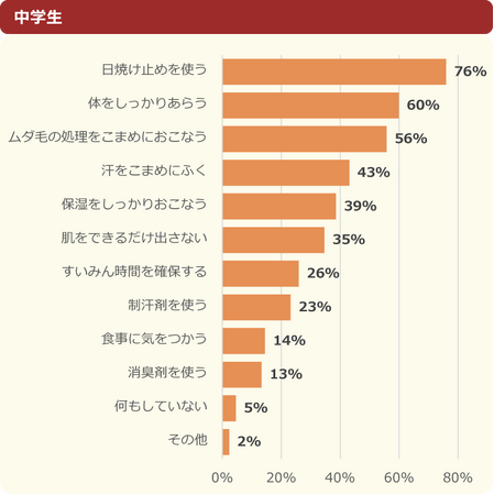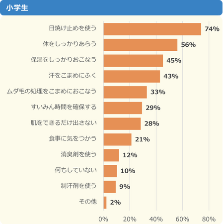 第1位は「日焼け止めを使う」、2位は「体をしっかり洗う」でした。3位以降は小学生と中学生では結果に違いが出ていて、小学生の3位は「保湿をしっかり行う」に対して中学生の3位は「ムダ毛の処理をこまめに行う」でした。「何もしていない」と答えた人は全体の1割以下でした。