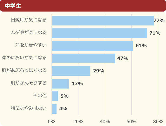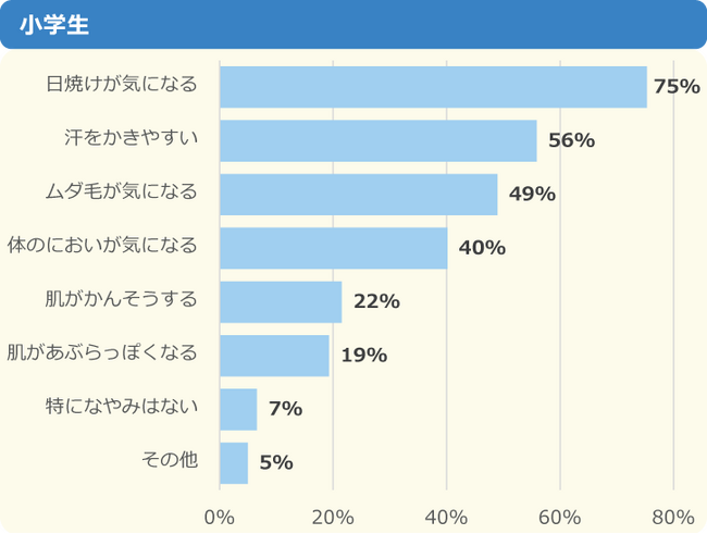 一番多かった回答は「日焼けが気になる」でした。2位の回答結果は小中学生で異なり、小学生は「汗をかきやすい」、中学生は「ムダ毛が気になる」でした。中学生になると腕や足の毛も少しずつ濃くなって目立つようになり、夏が近づくと半袖で過ごすことも多いため、体の毛が気になる人が増えるのかもしれません。
