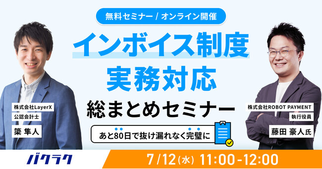 株式会社ROBOT PAYMENT(本社:東京都渋谷区、代表取締役:清久 健也、以下 当社)は、支出管理サービス「バクラク」を提供する株式会社LayerX(本社:東京都中央区、代表取締役CEO:福島良典)と共同で、2023年7月12日(水)11:00〜12:00 に無料のオンラインセミナー「あと80日で抜け漏れなく完璧に!インボイス制度実務対応総まとめセミナー」を開催します。