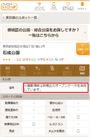 2021年12月より、板橋区公式サイトに掲載された板橋区の「子どもとおでかけ向け」施設のオープンデータを利用しています。データは「いこーよ」のサイトおよびスマホ向けアプリの「おでかけ」情報欄に掲載され、どなたでも無料でサービスをご利用いただけます。なお、情報欄にはオープンデータを利用している旨が記載されます。また、データの中には授乳やオムツ替えで利用できる板橋区の子育て施策「赤ちゃんの駅」の情報も掲載しています。施策の施設には「赤ちゃんの駅」のであることも記載されています。