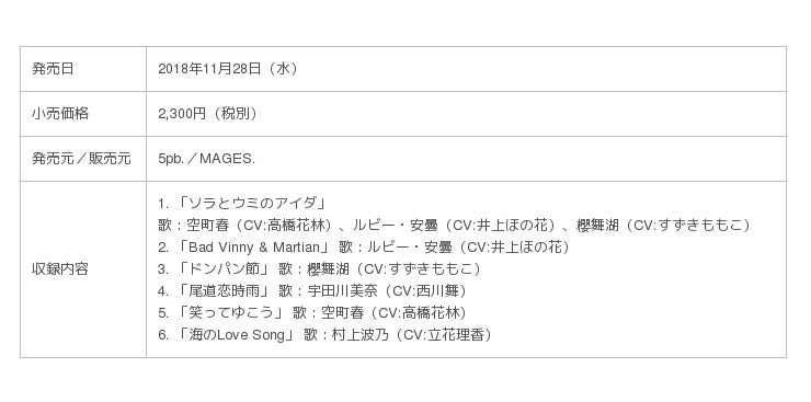 また、2018年11月28日(水)に発売となるTVアニメ『ソラとウミのアイダ』ボーカルソング集のジャケットデザインを公開しました。アニメのキャラクターデザインを手がける山本周平氏の描き下ろしイラストで、オープニングテーマ「ソラとウミのアイダ」を歌っている空町春(CV.高橋花林)、ルビー・安曇(CV.井上ほの花)、櫻舞湖(CV.すずきももこ)の3人が無邪気に歌う姿が描かれています。
