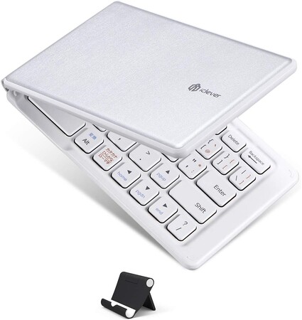 Bluetooth接続の折りたたみ式キーボードです。キーボードの外装は上質なレザーカバーで、質感と保護性を兼ね備えたデザインはビジネスマンに最適です。折りたたむとスマホほどのサイズになり、外出先への持ち運びに便利です。角度調節が可能なスマホ・タブレット用スタンドが付属しており、ノートパソコンのように使用できます。