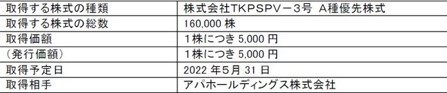 株式会社ティーケーピー(本社:東京都新宿区、代表取締役社長:河野 貴輝、以下TKP)は、当社の連結子会社である株式会社TKPSPV-3号および株式会社TKPSPV-4号が発行したA種優先株式の全部を取得したことをお知らせいたします。