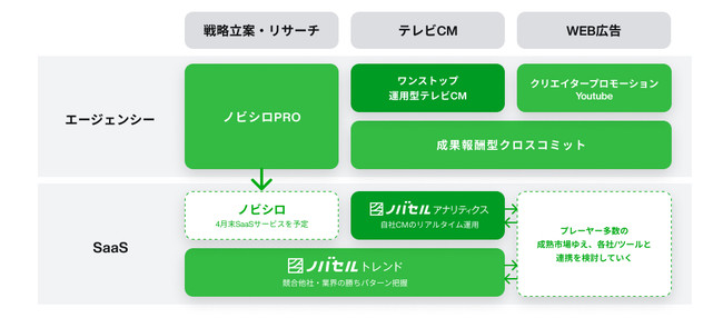 「ノバセル」は、独自の広告手法とクラウド型テレビCM運用ツールの活用により「運用型テレビCM」を提供しています。企画・制作・放映・分析まで一気通貫して行い、効果分析ツール「ノバセルアナリティクス」を活用することで、従来、難しいとされていたテレビCMの広告効果測定可能にし、広告投資の最適化を通して企業の成長を実現しています。さらに、企業のマーケティング活動に必要とされるSaaSプロダクトを自社開発し、複数の製品をご提供しています。今後も、テレビCM企画・制作・放映・分析およびマーケティングツールの提供により企業の事業成長を最大限に伸ばすサポートを行ってまいります。