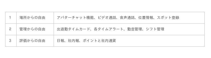 私達は、現代社会が抱える3つの不自由(場所、管理、評価)を解消し、社員をストレスから解放することで、イノベーションを起こす企業が誕生する空間を実現していきたいと考えています。