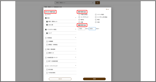 カテゴリ・条件・価格を掛け合わせた詳細かつ多数の項目で絞り込むことが可能で、宅配システムならではの利便性向上を実現しています。