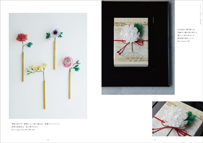 本書では、普段の暮らしや装いに取り入れられる「本物のような花つまみ細工」のレシピを、「四季を感じる花々」「贈りたい一輪の花束」「憧れの花を装う」の3つのシチュエーションごとに写真とともに丁寧に紹介。