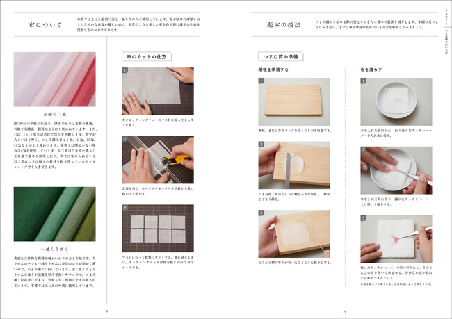 そのほか、写真を使って丁寧に葺きや染めの工程を解説。知っておきたいつまみ細工の基本の技法や、絹の染め方のポイントなど知りたい内容が満載です。みずみずしい生花のリアリティを追求した著者オリジナルの葺き方で、生花のような素敵な「花つまみ細工」を作ってみませんか?