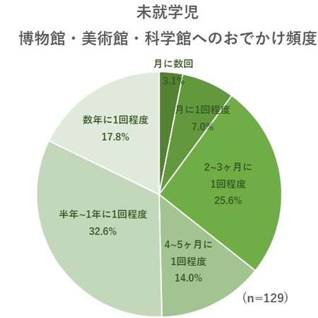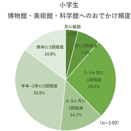 博物館・美術館・科学館へのおでかけ頻度は未就学児・小学生で差はなく「半年〜1年に1回程度」が30%、「2~3ヶ月に1回程度」が25%