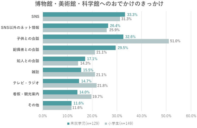 博物館・美術館・科学館へのおでかけを決めたきっかけでもっとも多かった回答は、未就学児が「SNS」、小学生は「子供との会話」