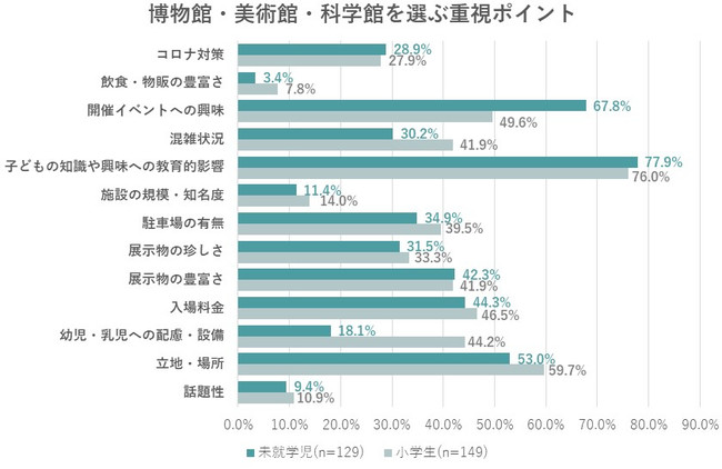 博物館・美術館・科学館を選ぶときの重視ポイントは、未就学児・小学生ともに「子どもの知識や興味への教育的影響」が1位。「開催イベントへの興味」は小学生のほうが多く、「幼児・乳児への配慮」「混雑状況」は未就学児のほうが多い結果に。「入場料金」は両方それほど重視されていない