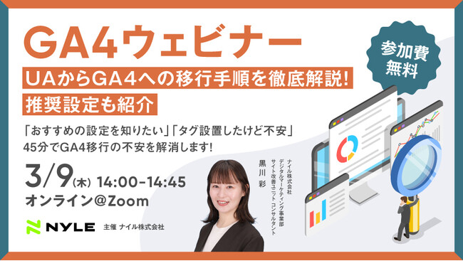 マーケティングDX事業を営むナイル株式会社(本社:東京都品川区、代表取締役:高橋 飛翔、以下、ナイル)は、ユニバーサルアナリティクス(UA)からGoogleアナリティクス4プロパティ(GA4)への移行手順を徹底解説するウェビナーを、3月9日(木)14:00より無料にて開催します。