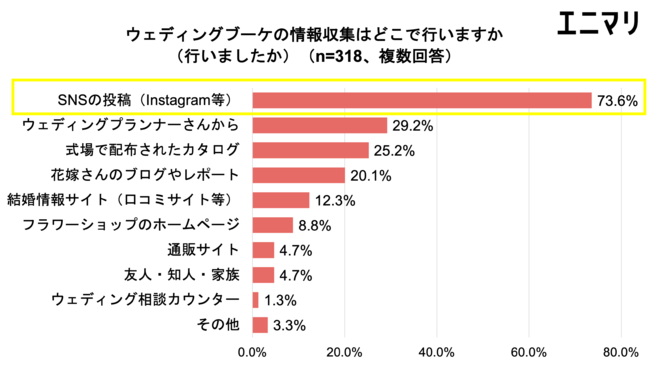 続いて、ウェディングブーケの素材についてきいたところ、自然ならではの華やかさや色合いが感じられる「生花」が63.8%となりました。一方、「できるだけ費用を抑えたい」「結婚式後もずっと綺麗に残したい」「事前にデザインを確認したい」といった希望から、「造花」12.6%、「アーティフィシャルフラワー」12.3%、「ドライフラワー」5.7%など、「生花以外」を選択する花嫁も約4割いることがわかりました。また、ウェディングブーケの情報収集はインスタグラムといったSNSを活用する花嫁が7割以上に上り、様々な選択肢の中から自分好みのデザインを選びたいという花嫁のニーズがうかがえます。