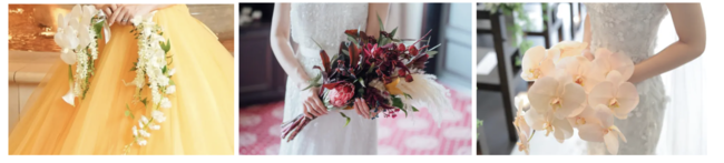 花の種類としては、胡蝶蘭、カランコエ、アンスリウム、オンシジウムが人気ですが、最近は花材を染めて季節や着用するドレスのカラーに合わせて発色するブーケを持つ花嫁さんもいます。