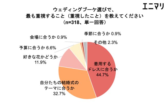 ブーケ選びで重視していること第1位「着用するドレスに合うか」44.7%、第2位「自分たちの結婚式のテーマに合うか」32.7%