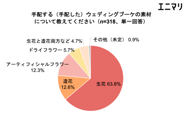 調査結果によると、ウェディングブーケ選びにおいて「着用するドレスに合うか」や「自分たちの結婚式のテーマに合うか」を重視していることがわかりました。また、ウェディングブーケの素材については、定番の「生花」が6割超を占める一方で、「造花」「アーティフィシャルフラワー」「ドライフラワー」などを選択する方も一定数おり、予算や用途に合わせて選択していることがわかりました。