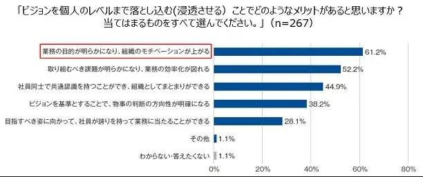 Jtb Communication Designによる調査によると、ビジョンの浸透によってモチベーションの向上や共通認識による一体感の向上などをメリットとして認識してる社員は多ることが分かっています。