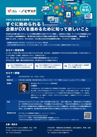 埼玉県戸田市は株式会社ビザスク(本社:東京都目黒区青葉台4-7-7)と連携し、民間の知見を使い官民で伴走支援を行う「戸田市DX伴走型支援事業」を6月29日(木)から開始するにあたり、下記のとおりプレセミナーを実施します。