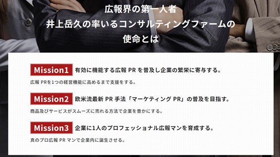 戦略広報の実践実務の第一人者で、トップ広報コンサルタントと称される井上岳久が率いるコンサルティングファームです。