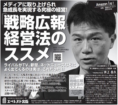 このたび販売が好調であることから出版元より日本経済新聞に広告で大々的に広告を掲載していただきました。この期待に応え戦略広報の実践実務書『戦略広報経営法のススメ』の著者、井上岳久が直々に解説する「戦略広報解説会&個別コンサルティング」を無料にて11月20日から5日間を延長して10日間で開始します。書籍の内容を著者から直に詳しく学びたい方はご参加ください。