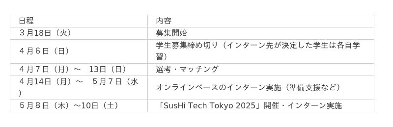インターンシップを行う学生は、「SusHi Tech Tokyo 2025」に出展する海外スタートアップの日本でのビジネス進出・拡大のために、文化的・言語的な翻訳、サービス開発に向けた市場ニーズの収集、ロジスティクスなどの準備を行います。これにより、海外スタートアップの日本進出や、日本企業との新規ビジネスの共創を加速させます。