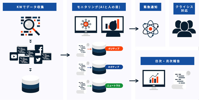 インフルエンサーの投稿をモニタリングし、不正広告や薬事法、景品表示法などのリスクを早期検知するためにSNSを24時間365日監視します。万が一緊急性の高い情報が検知された際は、緊急通知のうえ対応方針に関する危機管理コンサルティングを実施します。