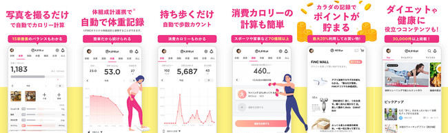 アプリをダウンロードして、スマートフォンを持ち歩くだけで毎日の歩数が貯まり、体重・睡眠時間・食事といったライフログの記録や、歩数に応じて、FiNC MALLで使用できるポイントが付与されます。また著名なアスリート・トレーナー・栄養士といった専門家が発信するエクササイズ・ストレッチ・ヘルシーレシピ・ヨガといった動画コンテンツや、20万件もの食品データベースをはじめ、様々な栄養及び運動プログラムを内蔵し、パーソナルトレーナーAIが、ユーザーひとり一人の興味や悩みにあったメニューを厳選してお届けいたします。ひとりではなかなか続けられない方でも、楽しみながら続けることができるアプリになっています。