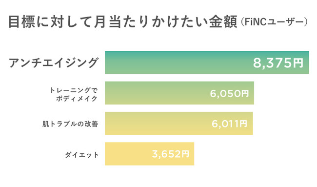 FiNCユーザーの方々の美容や健康にかける1ヶ月の費用は、ダイエットの場合3,000円程度、ボディメイキングや肌トラブルの改善には6,000円程度の金額設定と回答しています。