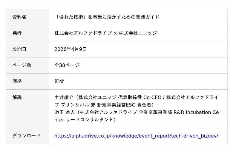 株式会社アルファドライブ(本社:東京都千代田区、代表取締役社長兼CEO 麻生要一 以下、AlphaDrive)と、AlphaDriveの子会社である株式会社ユニッジ(代表取締役Co-CEO:土井雄介 以下、UNIDGE)は、製造業をはじめとする企業のR&D・技術部門向けナレッジ冊子『「優れた技術」を事業に活かすための実践ガイド』を、2026年4月9日より公開しました。