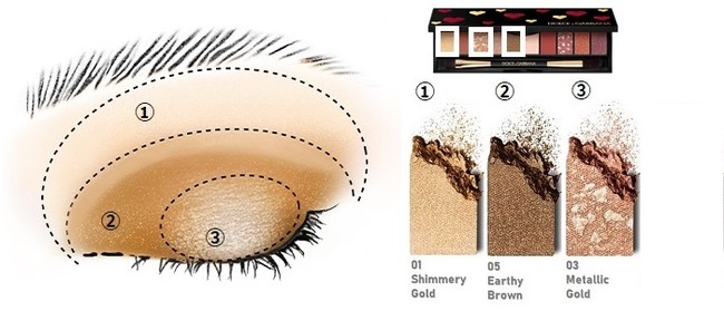 アイホール全体に、01 Shimmery Gold/シマリー ゴールドを、大きなブラシでふんわりのせる。