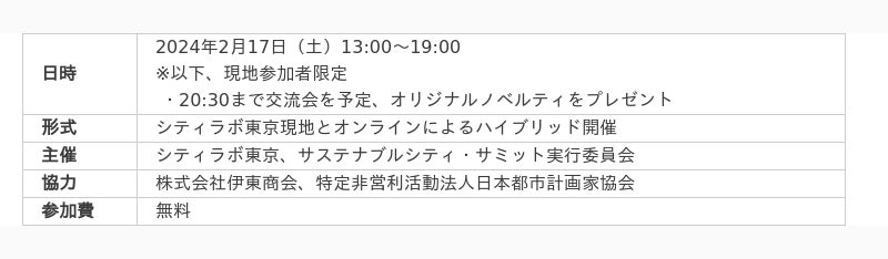 シティラボ東京(東京都中央区京橋、企画:東京建物株式会社、運営受託:一般社団法人アーバニスト)は、2024年2月17日(土)に「サステナブルシティ・サミット4」を開催します。