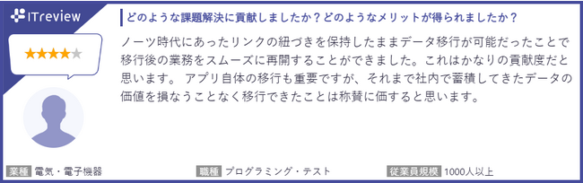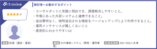 ITレビューには「多種多様なポータルが作成できる」「外部システムと連携できる」「コンサルタントに気軽に相談でき、課題解決しやすい」といったユーザーの声が寄せられています。ユーザー企業が抱えている問題に対して、ともにフォーカスして解決策を見出す活動などの取り組みが高い評価につながりました。