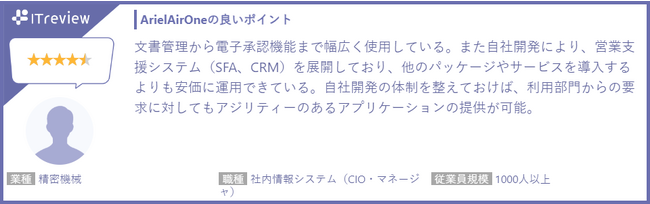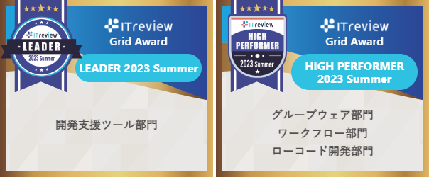 ITreview Grid Awardは、ビジネス向けソフトウェア・クラウドサービスのレビュープラットフォーム「ITreview(ITレビュー)」に、2018年10月〜2023年6月にかけて掲載された約11万件のレビューをもとに、満足度と認知度の高い製品を「Leader」、満足度が高い製品を「High Performer」として表彰しています。ArielAirOneは、開発支援ツール部門でLeader、グループウェア、ワークフロー、ローコード開発の3部門でHigh Performerを受賞しました。
