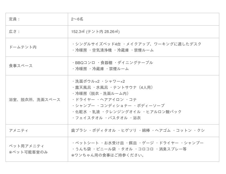 各室をそれぞれ敷居で囲い、プライベート性を重視したスペースの中に独立型のドーム型テントとハウス、露天風呂、テントサウナ、富士山の天然水を使用した水風呂を各室に設置。全天候型プライベート空間を実現しています。
