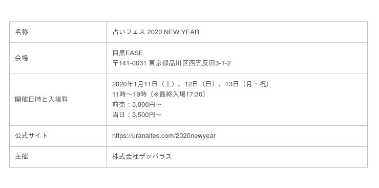 株式会社ザッパラス(本社:東京都港区、代表取締役:玉置真理)が開催する『占いフェス 2020 NEW YEAR』 (https://uranaifes.com/2020newyear)の詳細が決定いたしました。