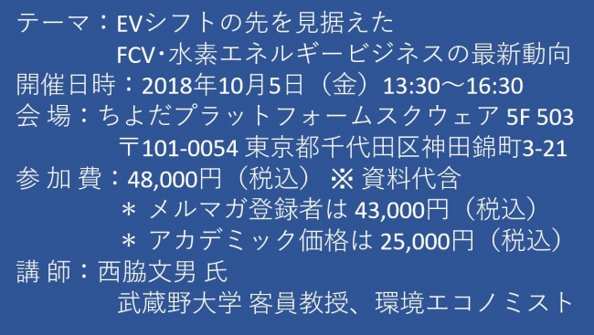 先端技術情報や市場情報を提供している(株)シーエムシー・リサーチ(千代田区神田錦町: http://cmcre.com/ )では、 各種材料他、二次電池やEV、燃料電池や水素エネルギーなどの市場動向・技術動向のセミナーや書籍発行を行っておりますが、 このたび「EVシフトの先を見据えたFCV・水素エネルギービジネスの最新動向」と題するセミナーを、 講師に西脇文男 氏(武蔵野大学 客員教授、環境エコノミスト)をお迎えし、2018年10月5日(金)13:30より、 『ちよだプラットフォームスクエア』ミーティングルーム B1F R005(千代田区錦町)で開催いたします。 受講料は、 一般:48,000円(税込)、 弊社メルマガ会員:43,000円(税込)、 アカデミック価格は25,000円となっております(受講料には資料代を含みます)。