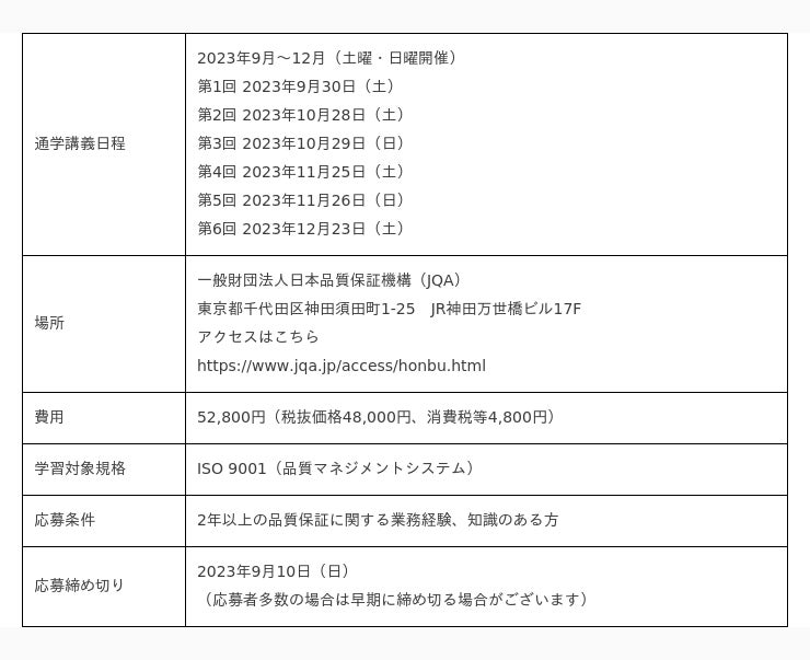 一般財団法人日本品質保証機構(本部:東京都千代田区、理事長:石井 裕晶)は、ISO審査員の仕事を体験する「JQA審査アカデミー」において、東京での『ISO 9001』2023年9月開講コース追加開催に伴い、現在、受講生を募集中です。